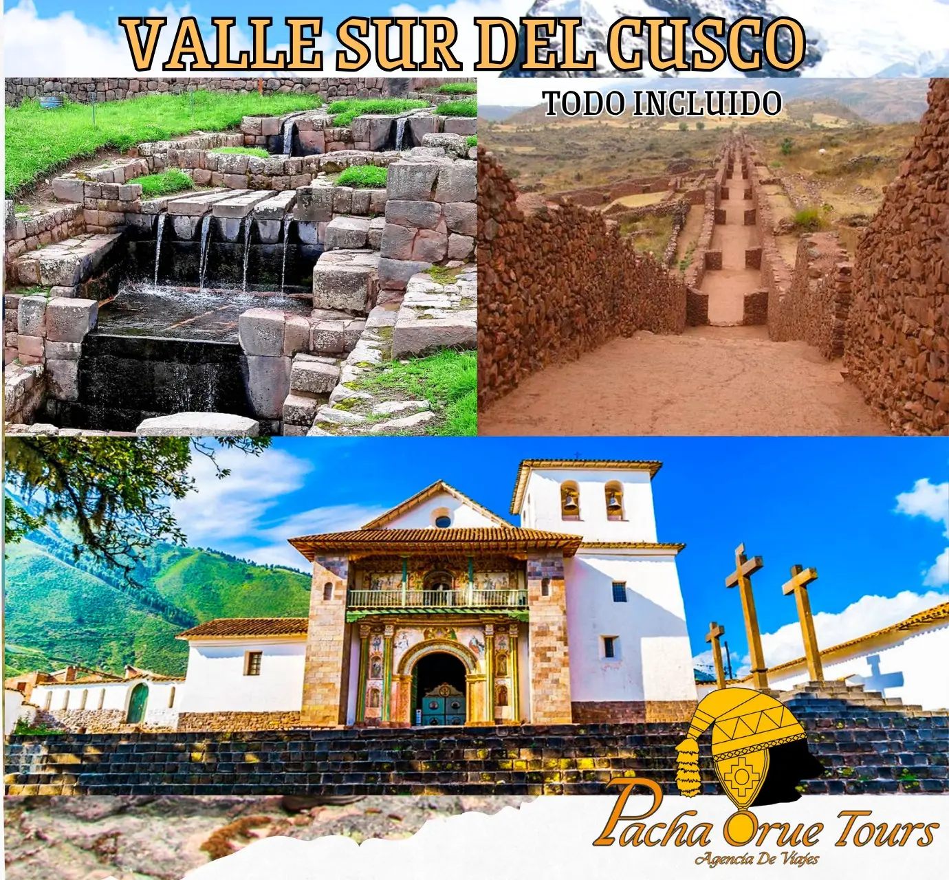 Tour Valle Sur Cusco, le permite conocer los atractivos los turísticos de Andahuaylillas pueblo antiguo con una iglesia colonial, Pikillacta resto arqueológico de la cultura Wari y Tipón, lugar donde se rendía culto al agua. Contiene recintos, terrazas, andenes, obras de irrigación y más